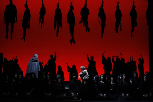 Comprimari were strong, but across the board somewhat green. So too, the countertenor Gerald Thompson (as a eunuch harem-keeper), though he sang with an appropriately innocent, airy quality. The choral writing, which has some of the lovelier bars in the piece, was delivered precisely and with devotion by the New York City Opera Chorus. The production, by Christopher Mattaliano, was all scrims and pattern light projections, which moved and changed frequently but had a “budget” look – appropriate, perhaps, under the circumstances. The costumes dated themselves worse than the staging, at times looking borrowed from an Otto Schenk Verdi production across the Plaza.