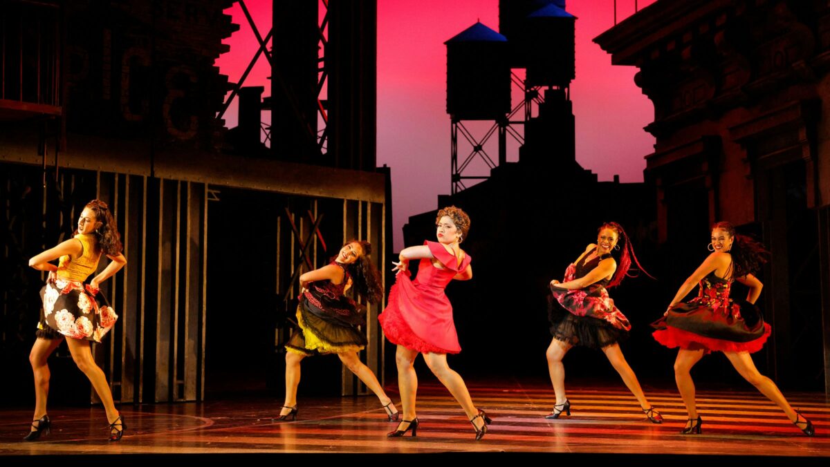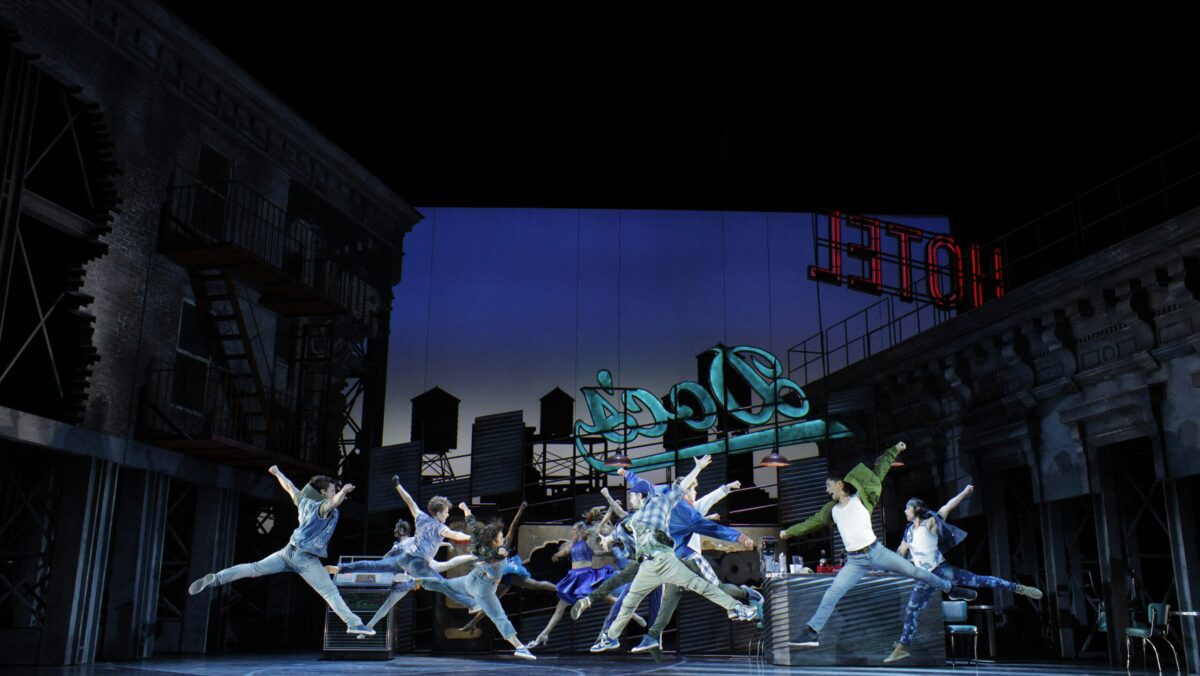 Francesca Zambello’s production—a co-production with Lyric Opera of Chicago, Houston Grand Opera (HGO), and the Glimmerglass Festival—originally premiered at HGO in 2018. For this staging, Zambello updated the setting to 2018, the year of the premiere, which is most notably reflected in Jessica Jahn’s hip-hop-inspired costumes (red and black for the Sharks, blue jeans and white for the Jets) and a poster of Bad Bunny in Maria’s room.