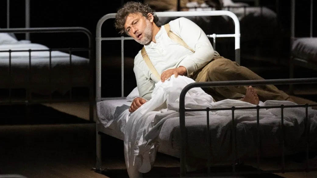 It is a kind of metaphysical high-Konzept jukebox musical that uses the songs of Schubert’s Schwanengesang along with the second movement from Schubert’s Piano Sonata D.960 as well as atmospheric interludes by Mathis Nitschke. The vast Drill Hall at the Park Avenue Armory has been reconfigured as a wartime hospital ward filled with wounded and their attending nurses. Deutsch’s piano sits at the center floating like a lighthouse in a sea of misery. Kaufmann, one of the patients, is at the moment where, according to Guth, “your soul steps out…and you understand that you are dying.” In its way, the Guth production of La bohème for Paris, set on a doomed space mission, has a similar focus