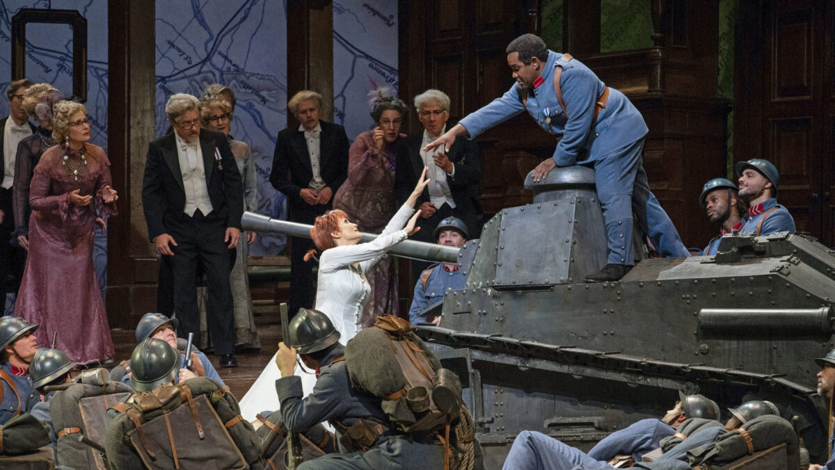 Laurent Pelly’s production, directed in revival by Gregory Keller, has conquered opera stages worldwide with its zany rendering of World War I aesthetics since its 2007 premiere at Covent Garden. (Opera goers in Milan and New York settled in for the same production last Friday night, and it will return to the Royal Opera House in July.) There is no barbed wire here: only lines of laundry bobbing across giant, Anthropolgie-esque maps of the Tyrol. Yet, the production’s quirks and gags felt fresh, due in large part to the cohesive ensemble work of its cast.