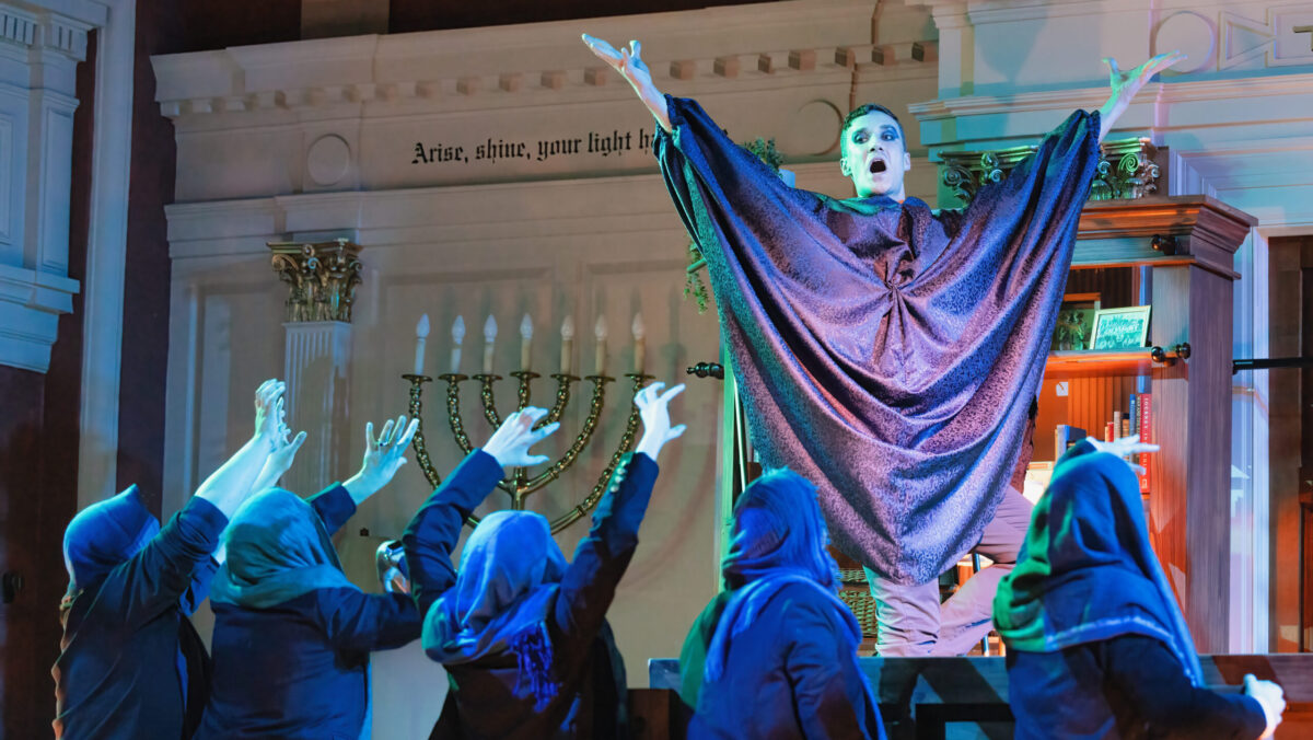 Charm was also the watchword of the performances, which were strong across the board, from the seven, beautifully blended treble voices in the chorus, to soprano Chelsea Helm’s warm, radiant Belinda to bass-baritone Hans Tashjian’s vivacious Sorceress. Tashjian played the Sorceress in drag, flanked by witches played by Cecilia McKinley and Kayleigh Sprouse—the only schoolgirl figures who sang principal roles. These witches were appealingly campy, if at times a little excessively hammy. McKinley in particular distinguished herself, with her strong, commanding contralto voice never, as Sprouse’s soprano occasionally did, becoming warped by the campiness of the sorceress schtick.