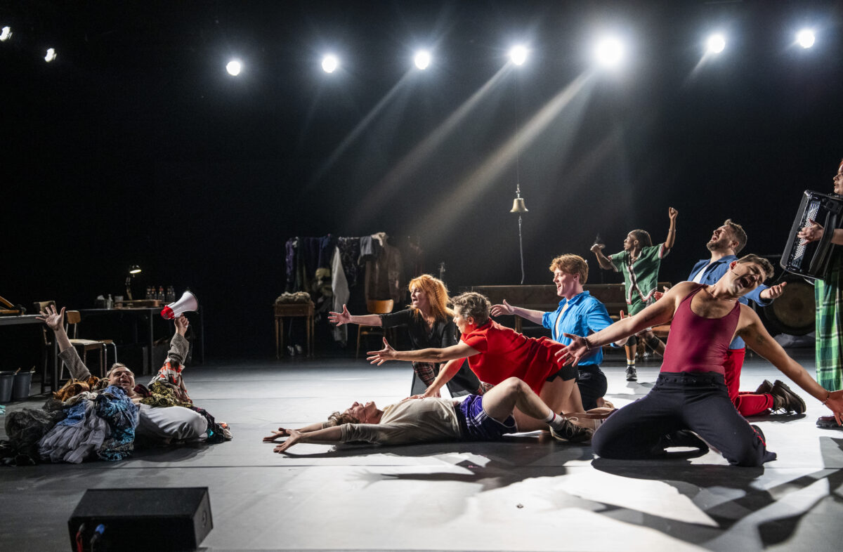 The show had a scrappy DIY vibe even before we took our seats: no proscenium, no wings, no pit, and no set. All the props, changes of costume, and instruments were lined up at the edge of the empty stage while the performers lounged, stretched, and conversed out of character in full sight of the audience. If this stage and bleacher seating hadn’t been erected at full size in the Drill Hall of the Park Avenue Armory, the setup wouldn’t have felt out of place in a tiny black box somewhere downtown.