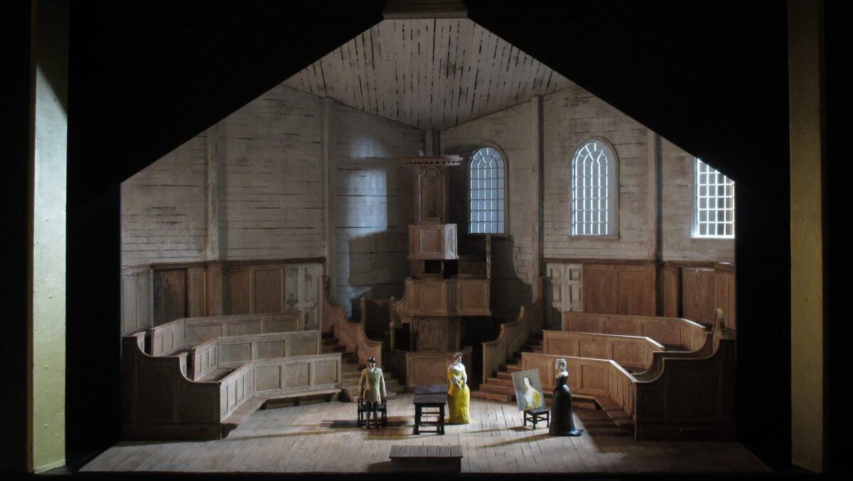 In rehearsal, the acoustically active set thundered and echoed like a creaky old church. Light comes in through slats in the planks as well as windows, creating a shifting kaleidoscope of golden sunlight or ghostly moonlight. This contrasts with the stark simplicity of the meeting house. Edwards’s I puritani is New England gothic at peak romantic saturation. Sitting in on rehearsal, I was immediately brought back to the hours I spent as an undergraduate in the Berkshire wilds, skulking around colonial houses and smoking clove cigarettes in puritan cemeteries.