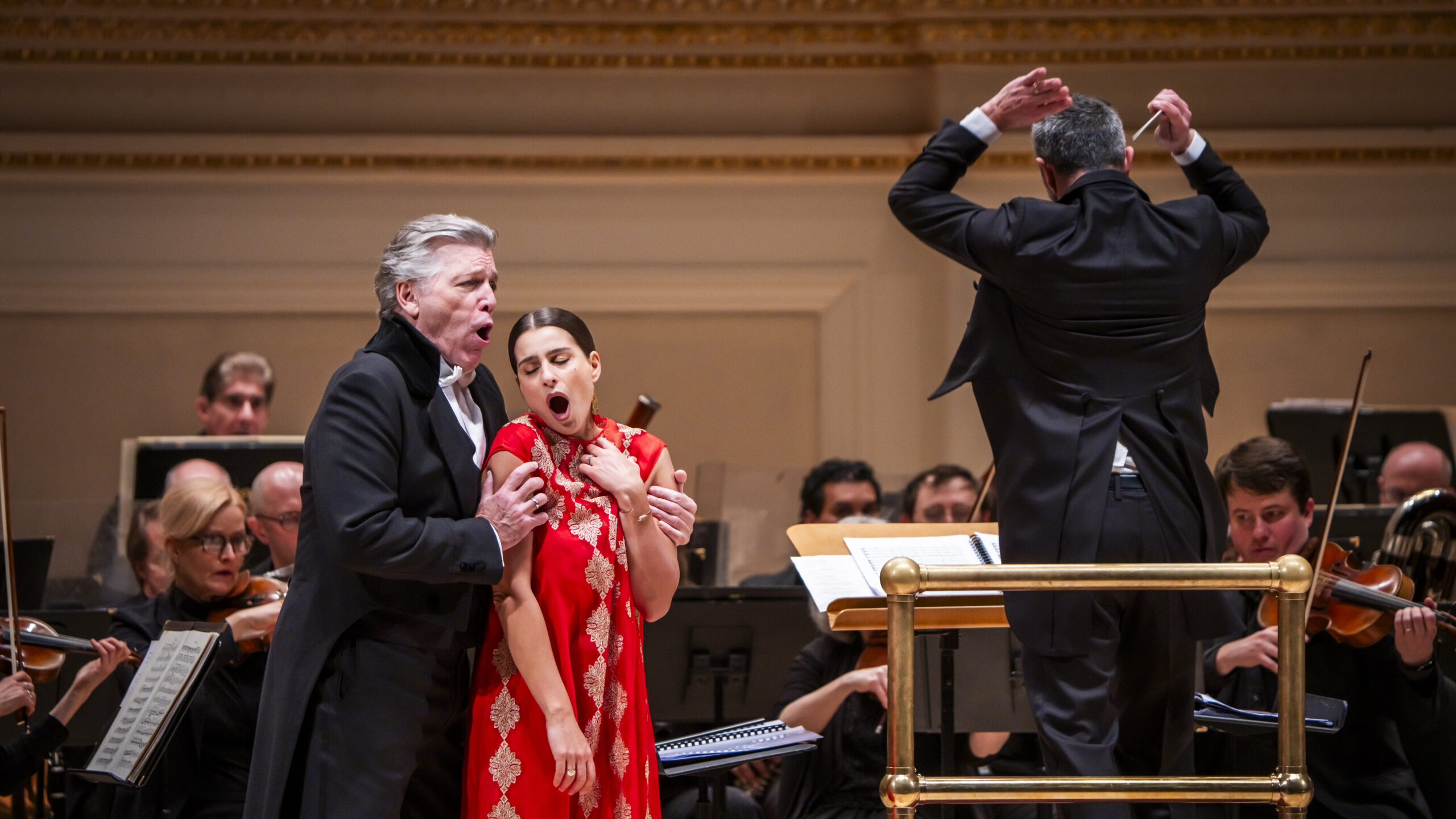 Beginning the vocal portion of the evening with a bang, Grigorian offered an unusually nuanced, yet still impressively powerful “In questa reggia” from Turandot. On entering, the Lithuanian soprano was greeted with only polite applause, but after rocking the Puccini, her subsequent numbers aroused loud and hearty ovations, particularly a haunting “Song to the Moon” from Dvořák’s Rusalka, one of her signature operas. Absent from the Met for nearly nine years, Hampson at 70 joined Grigorian in a potent performance of the final duet from Eugene Onegin. As with several of the numbers throughout the evening, the pair dropped usual staid concert decorum and, using the full width of the Carnegie stage, brought striking dramatic commitment to the opera’s poignant finale. Based on this searing excerpt, Grigorian’s Met Tatiana this spring should be something special.