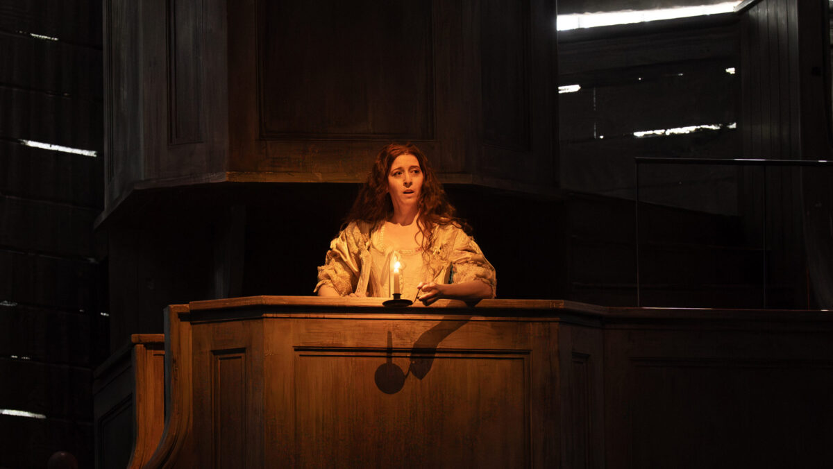 Edwards designed the sets, too, and the Puritan meeting house unit set looks like if M.C. Escher re-did the House of the Seven Gables. It’s imposing and attractive, yes, but the trapdoors, ‘exterior’ exits that open up to hallways, and, most laughably, a second-story window through which Enrichetta and Arturo make their escape shows just how little a grasp Edwards has over this world of his creation. The picture-perfect, almost entirely greyscale costume designs (by Gabrielle Dalton) might have a second life in a production of Robert Ward’s The Crucible, and Tim Mitchell’s lighting is intermittently evocative and heavy-handed, though shaky follow-spots often dulled the effect of solo moments.