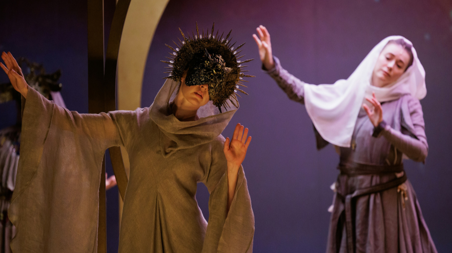 Sophisticated new music instrumentation, combined with some quirked up musical theatre-style recitative, made up most of the music. The instrumentation, and in particular the use of the harp, was full of bright, clean, high modern thrills. The conducting was sharp, fast, and exciting. I was thoroughly dazzled by the scenes of Hildegard’s visions, which included excellent singing, design, and dancing. The angel performers wear elaborate masks and rich, sumptuous gowns depicting illuminated manuscripts of Hildegard von Bingen’s own writing. Deborah Johnson’s background projections in these scenes pay homage to existing illuminations of the saint’s visions, melding them with contemporary design and animation to create a new aesthetic whole. The music in the vision scenes, which I assume borrows from Hildegard von Bingen’s plainchant, was immaculately arranged and performed. The art that the prophetess made and what she wrote about is so interesting in and of itself, I wondered why Snider chose to sequester the actual person and her works to these handful of scenes. I could easily have watched 3 hours of just these scenes, which have exactly the right combination of modern and medieval ingredients. They reach for that intimated understanding of life in a different era and do not condescend to the audience with contemporary melodrama.