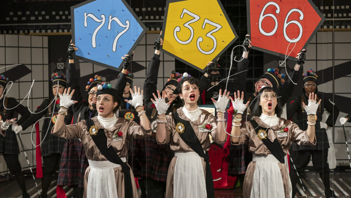 Gordon and Foreman are aesthetically well matched. Objects, images and symbols—boxes, Xs, stripes, golf clubs, those little colored balls—repeat all over Foreman’s manically detailed visual designs, while the blocking and choreography create deeply layered, kinetic stage pictures; Gordon’s primary composition strategy, here as elsewhere, is to introduce simple, albeit asymmetrical musical ideas with a rock-steady pulse, and then demonstrate how they can be combined in close counterpoint to create something complex and unpredictable. Foreman’s lighting (designed by Joe Levasseur) alternately dazzles the audience and plunges the stage into total darkness, while Gordon’s heavily amplified sonorities provide the audio half of the audiovisual overload.