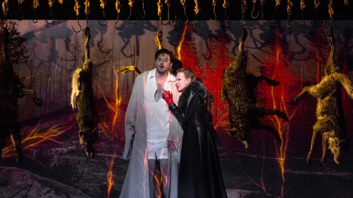 In the second tableau, we meet our protagonist, Peter, who sings an aria invoking the goddess Anubis. The vocal writing for Peter (baritone Samuel Hasselhorn) was an improvement, with Pintscher giving Hasselhorn long vocal phrases to showcase his abilities. In Peter’s aria, the orchestration moves out of the way for the sung phrases, the vocal writing depicting wind wisping through the space between the trees. Here, however, is when the libretto begins to fail us. Peter sings of how he is “consumed by sorrow,” yet we don’t know why (other than because he was born on a Sunday?) The staging, directed by James Darrah Black, does not give us any answers either, as ropes hoisting a collection of dead wolves descend and hang over the stage, remaining there for the entire opera. In the next tableau, we meet Clara (soprano Sophia Burgos), Peter’s lover. Burgos’ coloratura sparkled above the forest soundscape, singing along with bird song provided by the woodwinds. Yet, the audience is left to assume details of their relationship from their body language, rather than the libretto or accompanying musical material.
