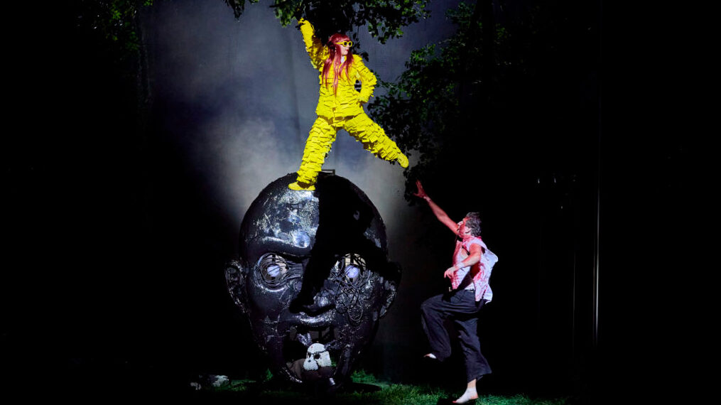 Concerning the production: The deep, dark forest is present throughout. In the first act, you can just about make out, in the gloom, the skeletal structure of the exploded Valhalla in the background. In Act II, the forest is less dense and the skeleton has moved a little closer. In the last act it’s prominent. The trees – big and realistic, as I said, are suspended, tops pointing down, and there’s a horizontal fir thrusting in on each side. Though mutants, or perhaps because of it, the trees are lush with rustling greenery, and have a life of their own, moving up and down, or in and out, and often overlayed with flickering video, to beautiful effect. But in the poisoned atmosphere, even the cyborgs or androids staggering through the forest are sick.