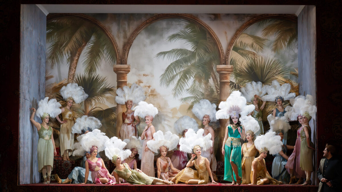 The libretto’s blatantly homoerotic scenes – starting with the Act I trio Princesa misteriosa where Darío takes the uncaring Benamor’s place to accept Juan’s courting, swiftly converting an awkward three-way conversation into an impassioned love duet – are mined for full affect, yet Loy also ups the siblings’ “wrong” gender presentation, unchanged throughout the work (even as Benamor courts the odalisques and wins a kiss from Nitetis), with a cheeky casting choice. Both Darío and Benamor have been composed for sopranos: Darío’s part is taken by male soprano Federico Fiorio. It’s not a move that I’d applaud elsewhere, but here, it both effortlessly spoofs the stereotypical gender norms espoused by the characters, and thwarts any recourse to the “proper” heterosexual order: you cannot forget that the two couples onstage are sung, respectively, by two men and two women.