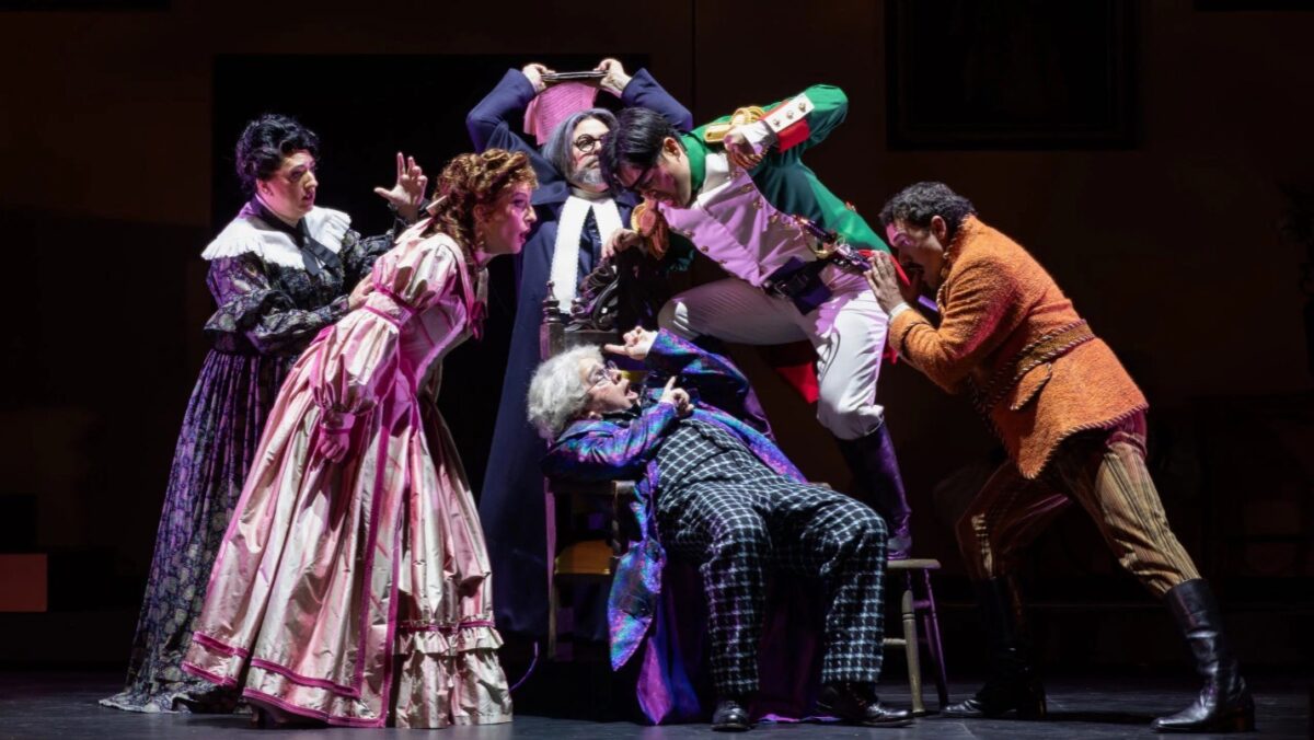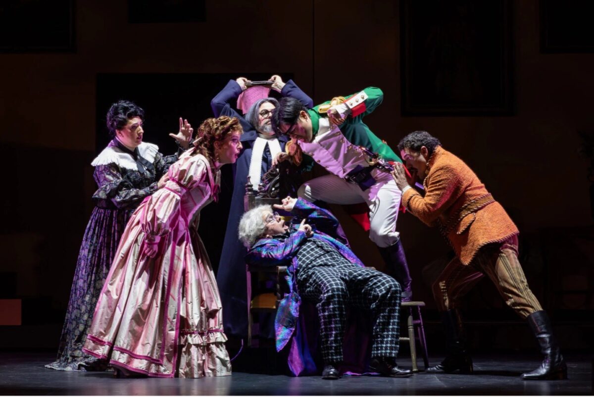 Hudson set the action in 1820s Seville, a period when commedia dell’arte was transitioning into a “nineteenth-century performance style.” LeFebvre’s costumes underscored this transition, using kaleidoscopic colors in most characters’ costumes, particularly for Almaviva, Don Bartolo, and the soldiers, while keeping Figaro in earthy colors, as if to symbolize that he was the most well-rooted person in the room. If I may nitpick, I felt Rosina’s dress was a little too Victorian for my taste. Wallace took a simple, almost minimalist approach to Doctor Bartolo’s house, with a hint of Spanish colonial architecture. Unfortunately, two giant black curtains hanging on either side were visible to the audience (at least to me) and somehow cheapened the staging. Nevertheless, the combination of his sets and Bieber’s sepia-toned lighting effectively depicted Seville in the 1820s. In other scenes, Bieber highlighted each character under spotlights, never losing sight of who was currently singing, making the production a joy to follow without being overly reliant on subtitles.