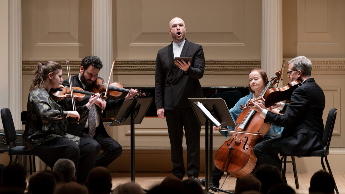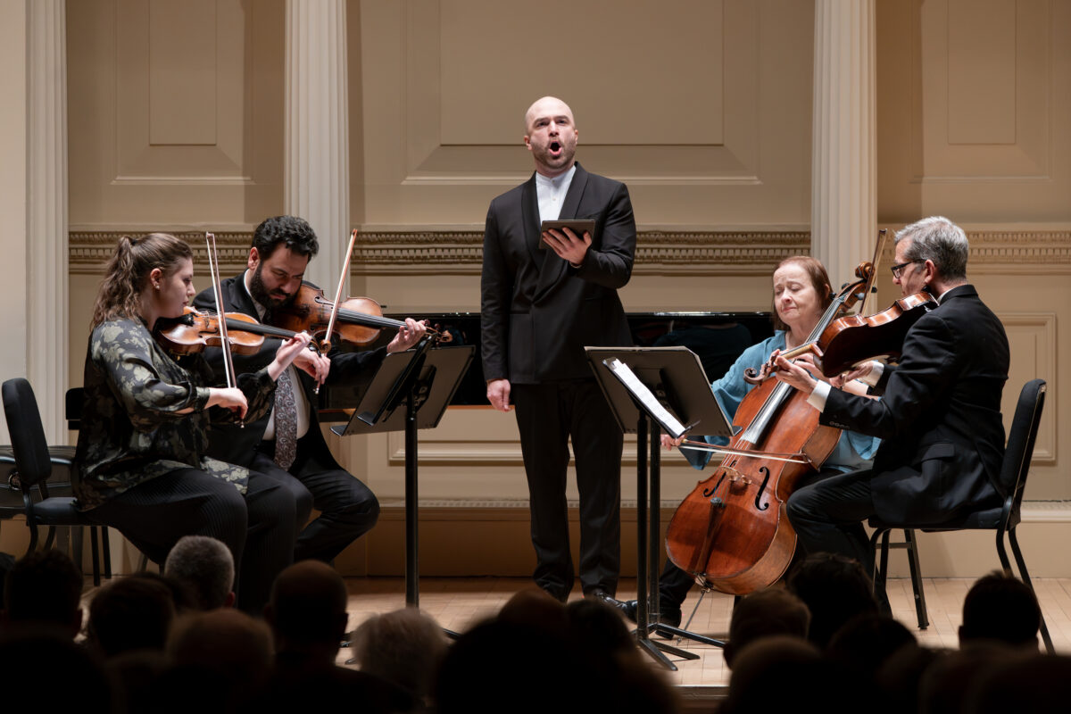 “Dover Beach”, set to the 1856 poem by Matthew Arnold, is a rumination looking over the sea where the beauty of nature turns into a spiritual crisis over the state of humanity, “where ignorant armies clash by night.” (I hear you, Matthew.) The soft-textured, dark timbre of Brancy’s baritone was like a fifth instrument alongside the two violins, viola and cello (Alex U Fortes, Emma Frucht, David Cerutti, and Daire FitzGerald), perfectly integrated and balanced with the instruments but still front and center. The original string quartet version of the “Adagio for Strings” sets the ruminative power of the melody in a starker, yet equally effective format. It is bookended by the more restless first and third sections – again anxious and agitated spirits is contrasted with brooding lyricism as in “Dover Beach”.