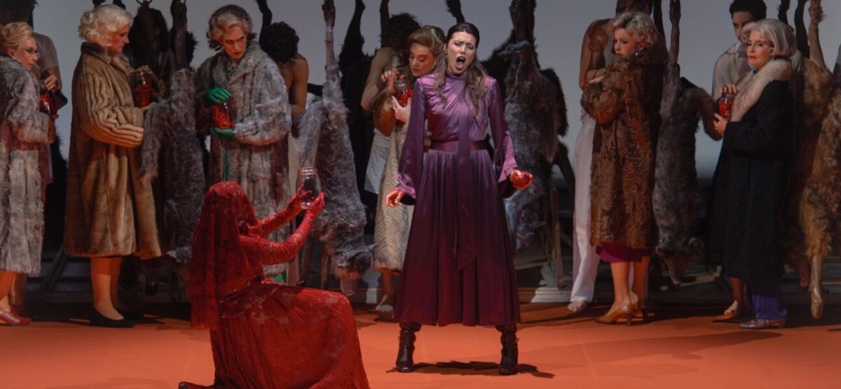 James Darrah Black’s production illustrates the fable without elucidating — rather the opposite. It leans heavily on strong visuals, starting with an enveloping forest backdrop, with shifting forms and changing light that seem to follow the shifts of the score. This is joined later by a second forest, of dead wolves suspended on ropes by their hind legs, striking to see but hard to understand — something to do with Anubis? The director complicates the already enigmatic tale by more-than-doubling the mother and son: he brings in a whole monstrous army of bourgeoises in big hair and furs, each holding a heart, and of young men in white — like Peter — with bleeding wounds in their chests. Apparently he takes a dim view of domineering, middle-class mums, no doubt rightly so. At the end he also hints, as their identical dresses are revealed, that Anubis and the Mother are one and the same. Another enigma to ponder.