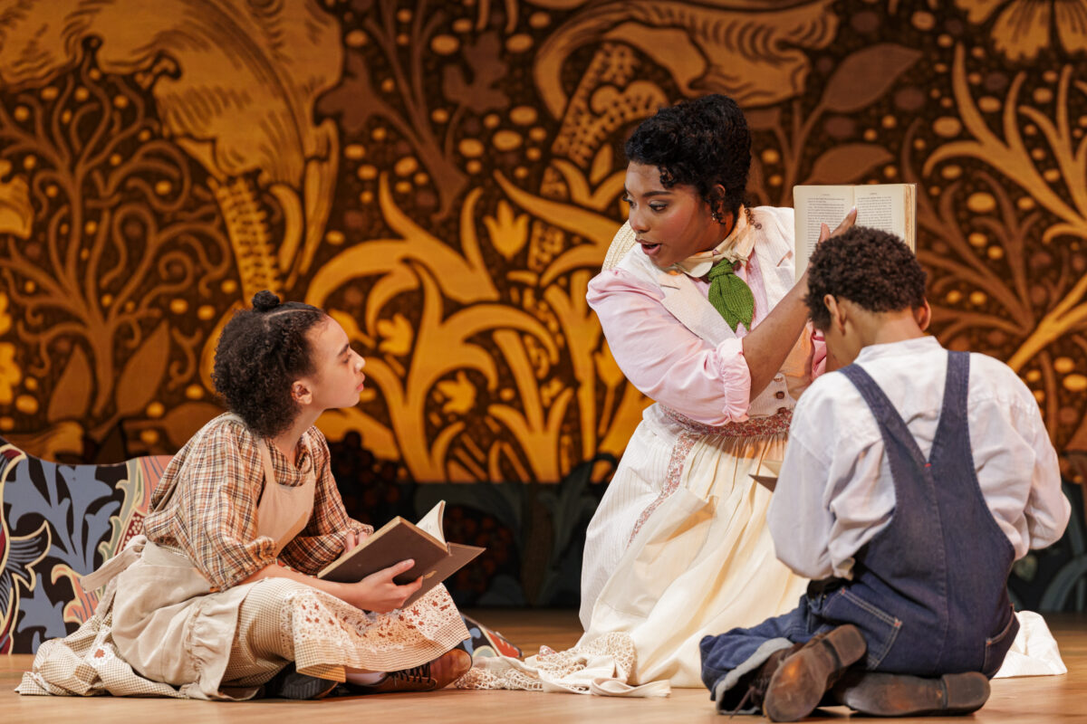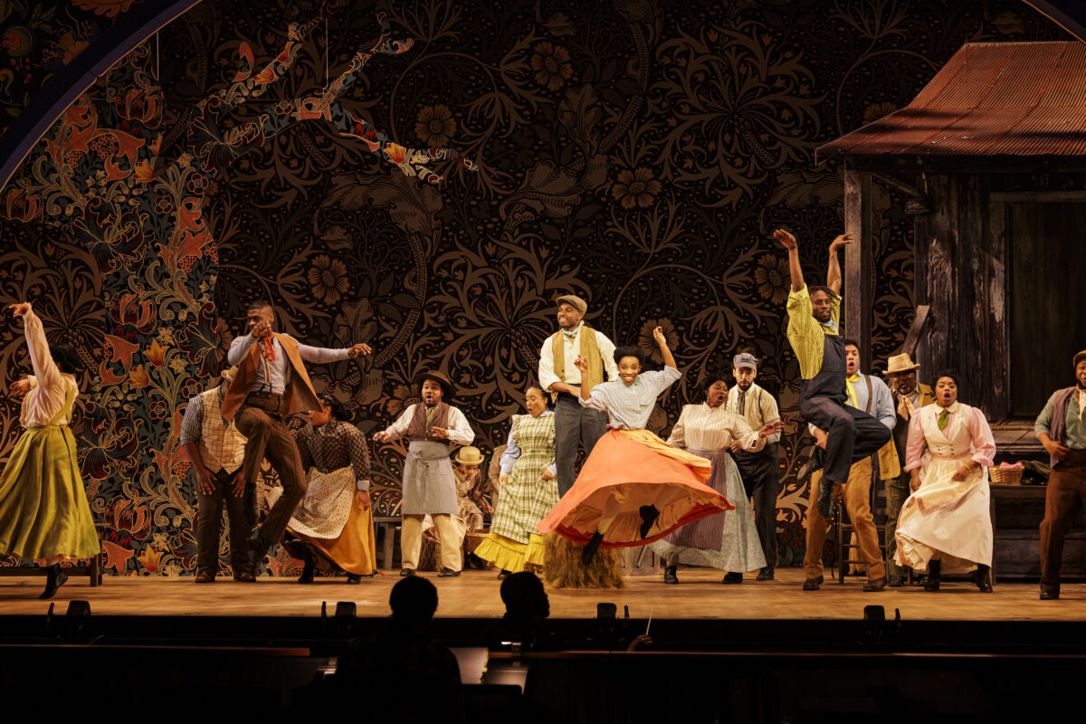 Mezzo-soprano Denyce Graves, continuing her directing career after her recently announced retirement from the operatic stage, depicted Treemonisha as a humble yet courageous leader. Graves’s production powerfully evoked the Reconstruction-era South, capturing the joy and pride of Treemonisha’s community even as they faced danger from the troupe of conjurers on one hand and white supernumeraries, who inspected papers and oversaw the labor of Black farmworkers, on the other hand. Her blocking of the large cast made effective use of Lisner’s smaller stage, particularly in the charismatic worship scene, which featured characters having full-body religious experiences. Under Graves’s direction, the conjurers were reminiscent of African or Caribbean folk traditions. The creative team’s decision to add a new romance between Treemonisha and Remus, finishing with a wedding and jump over the broom in the final scene, added greater emotional resonance to the story. Other choices were not as successful: A pantomime of Treemonisha’s life story during the opera’s overture gave away the plot before Monisha revealed her adoptive daughter’s origins to her in one of the opera’s major arias, while sound effects of growls during Treemonisha and Remus’s flight from the forest proved to be more cheesy than threatening. Set design by Lawrence E. Moten III effectively suggested the era with a small ramshackle house and attractive patterned backgrounds resembling the 19th-century floral designs of William Morris and the Arts and Crafts Movement. Costumes by Lynly A. Saunders created a striking contrast between sober late 19th century period outfits and riotously colorful patched looks for the conjurers.