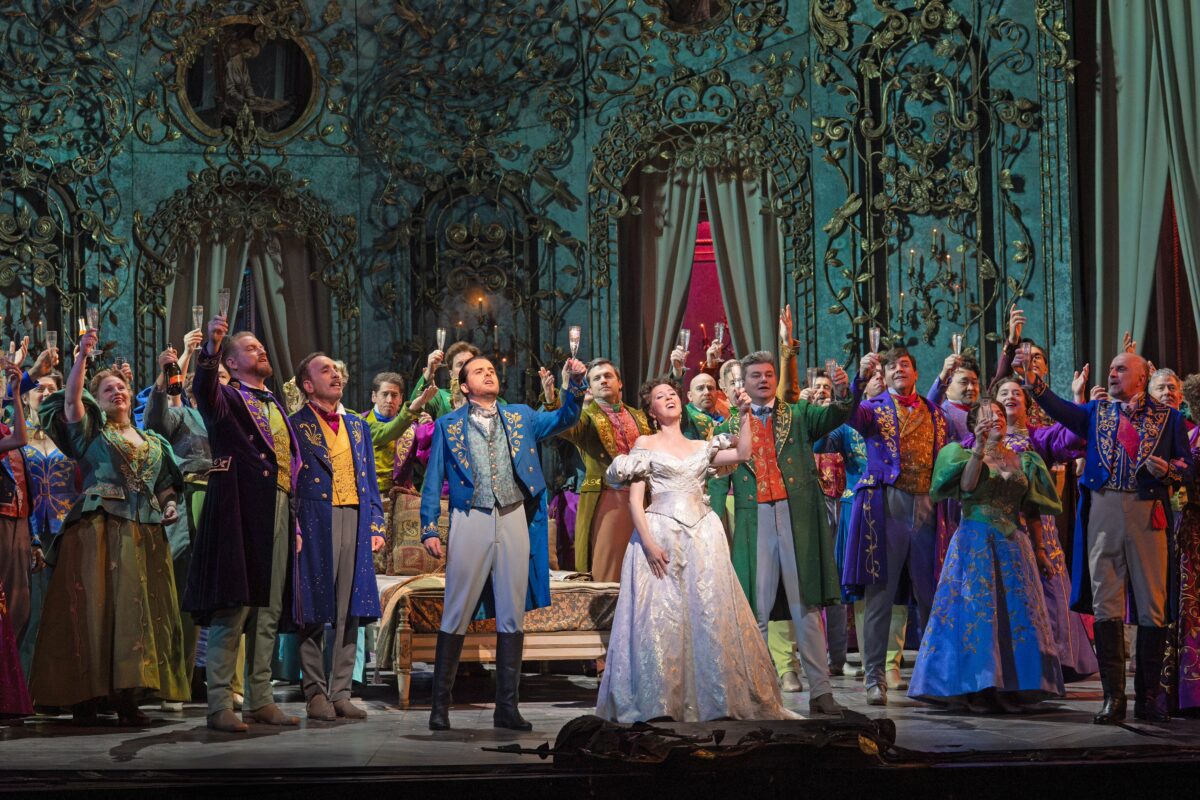 Something about Michael Mayer’s production of La traviata—those lush, pastel sets, drizzled in rinceaux; that plump, white rose be-speckled in dewdrops, the hues and patterns of the costumes changing according to the season—brought out the cynic in me. It goes from witty and decadent to merely garish before Violetta even goes broke. After the initial dazzle, the lily just keeps getting gilded and re-gilded. By Act II, I felt like I was just looking at an Instagram wedding where hundreds of thousands have been spent on the orchids alone.
