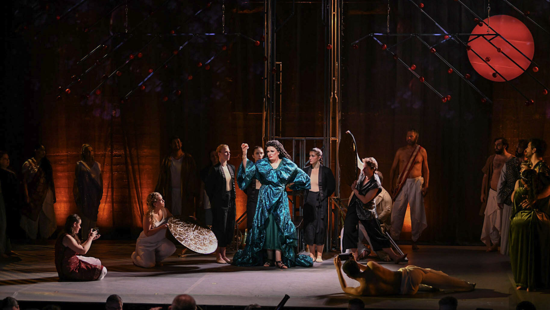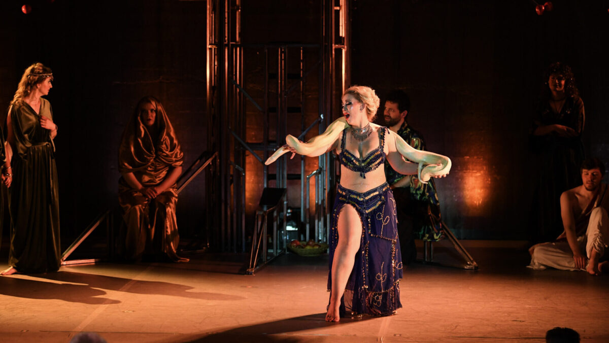 While the scene itself, especially the belly dance-esque performance playing out, is anything but docile, the snake remained calm around the shoulders and arms of the performer. At times the dance would bring the snakes face so close to her own I would hold my breath for a moment expecting to see someone be bitten — but to my relief, and enjoyment, neither animal nor performer was hurt during the scene. As the dance continues, the snake is passed back to a background character (his trainer) and while they stay on stage for a few minutes afterwards interacting with Nicias, they both eventually exit the stage as the dance continues.
