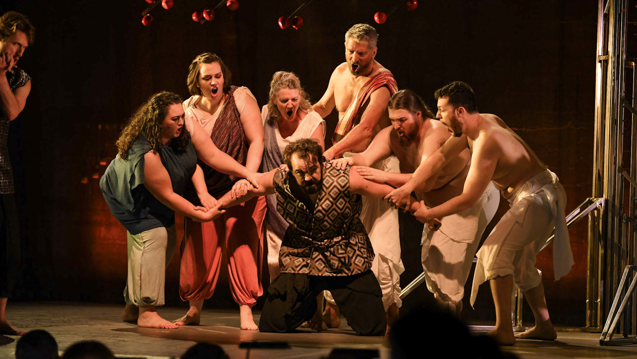 Partway through Act I, we are introduced to Nicias (portrayed by Cody Laun, tenor). While his voice did not command the same amount of attention as Scofielm, the way in which he physically portrayed the character was spot on in my mind. His ability to make me feel as if he truly was a man of wealth and excess without a care in the world was something that further engrossed me. He sauntered — and even at one-point (in Act II) crawled across the floor — on the stage in ways that truly fit the description of the character he is portraying. Alongside Laun’s Nicias we are also introduced to Myrtale (Jordan Bowman, soprano) and Crobyle (Christina Mancheni, soprano) who both played into the parts as compatriots to Nicias in his excess and free flowing way of life.