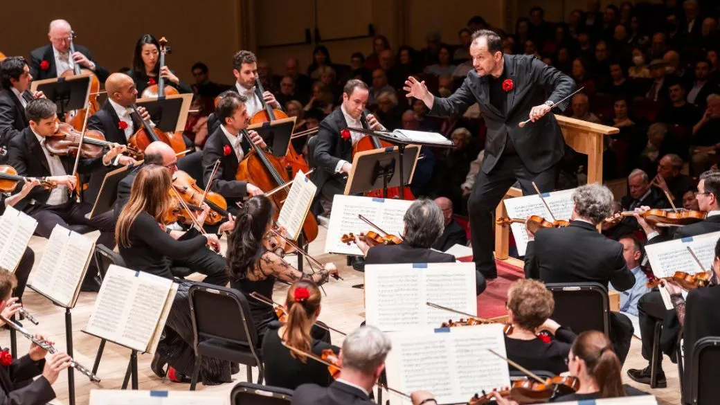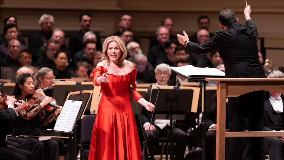 As the orchestra filed onto the Perelman Stage, an unusual sense of purpose for a midweek concert descended over the hall. The musicians, red blooming from their boutonnières or behind their ears, turned to face the waiting audience, who applauded in the way a crowd greets someone who has undergone some horrendous ordeal and emerged “brave.” Then Nelsons, flanked by Renée Fleming (also in red) and Thomas Hampson, emerged to the audience’s roar. The tone of the evening came into focus: This was symphony as solidarity.