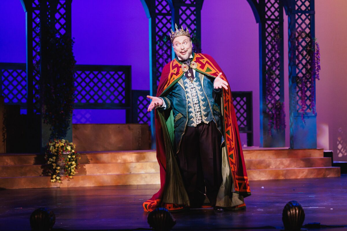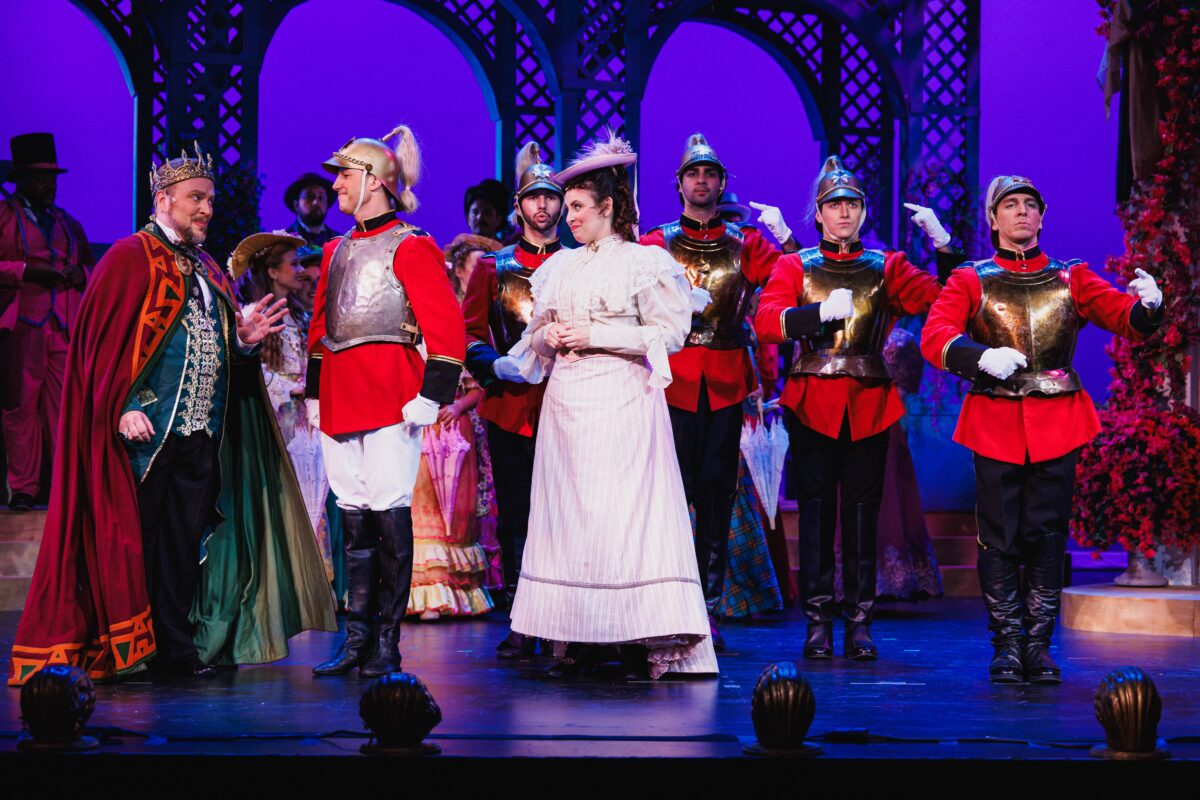 As King Paramount, comic bass-baritone Matthew Wages was a study in easily deflated pomposity and droll humor – his facial reactions were a study. As the starchy English governess Lady Sophy, mezzo Hannah Holmes perfected the perpetually offended air of looking down her nose at perceived improprieties. Vince Gover and Lance Olds, as the two Wise Judges, were a sterling comedy team – Gover, in particular, was very good at hysterical meltdowns. All the ladies, led by Sophie Thompson as Princess Zara, looked fetching and played their silly parts with poker-faced sincerity. Tenor Cameron Smith nailed his Act II solo “Oh, Zara, my beloved one, please bear with me!” where the besotted soldier Captain Fitzbattleaxe complains that sincere passion is fatal for tenorial high notes.