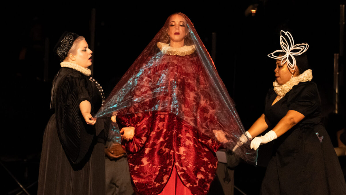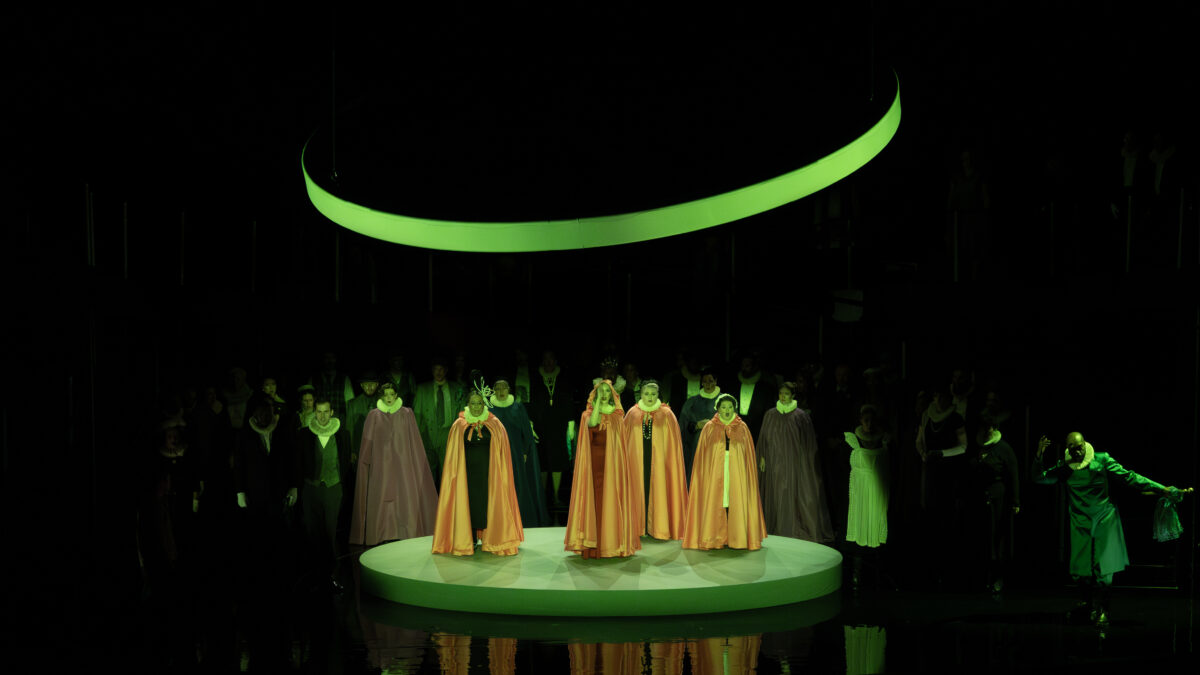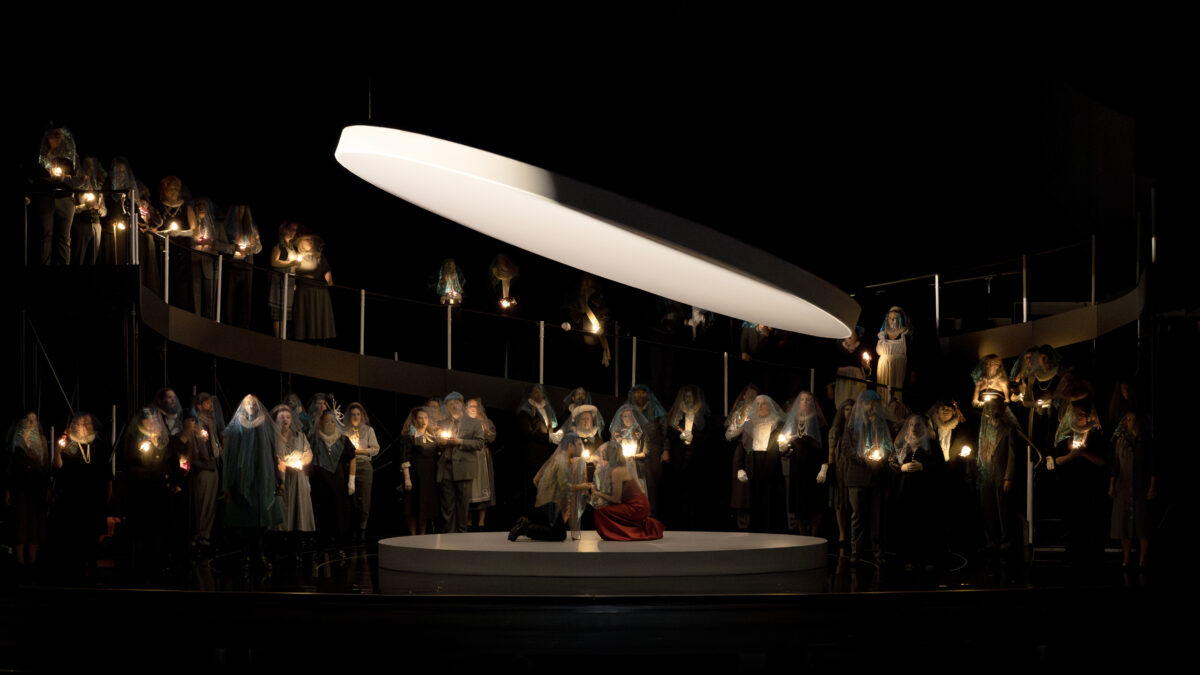 The production, too, reinforces ambiguity. Elegantly curved ramps serve as a kind of onstage choir loft, and both chorus and individual characters are costumed in a mélange of periods. Some Elizabethan ruffs suggest a link to the early origins of the story. A large disc is suspended above, moving to sometimes suggest a force that shapes the action (or what here passes for action). Lovely hand-held lanterns provide mood. Everything is ultra chic, in a way I now associate with Artistic Director Anthony Roth Costanzo, including gauzy veils that sometimes adorn the characters and at other times are removed. (The stage director is Jenny Koons; set, lighting, and costumes are by Jason Ardizzone West, Yuki Link, and Maiko Matsushima respectively.)