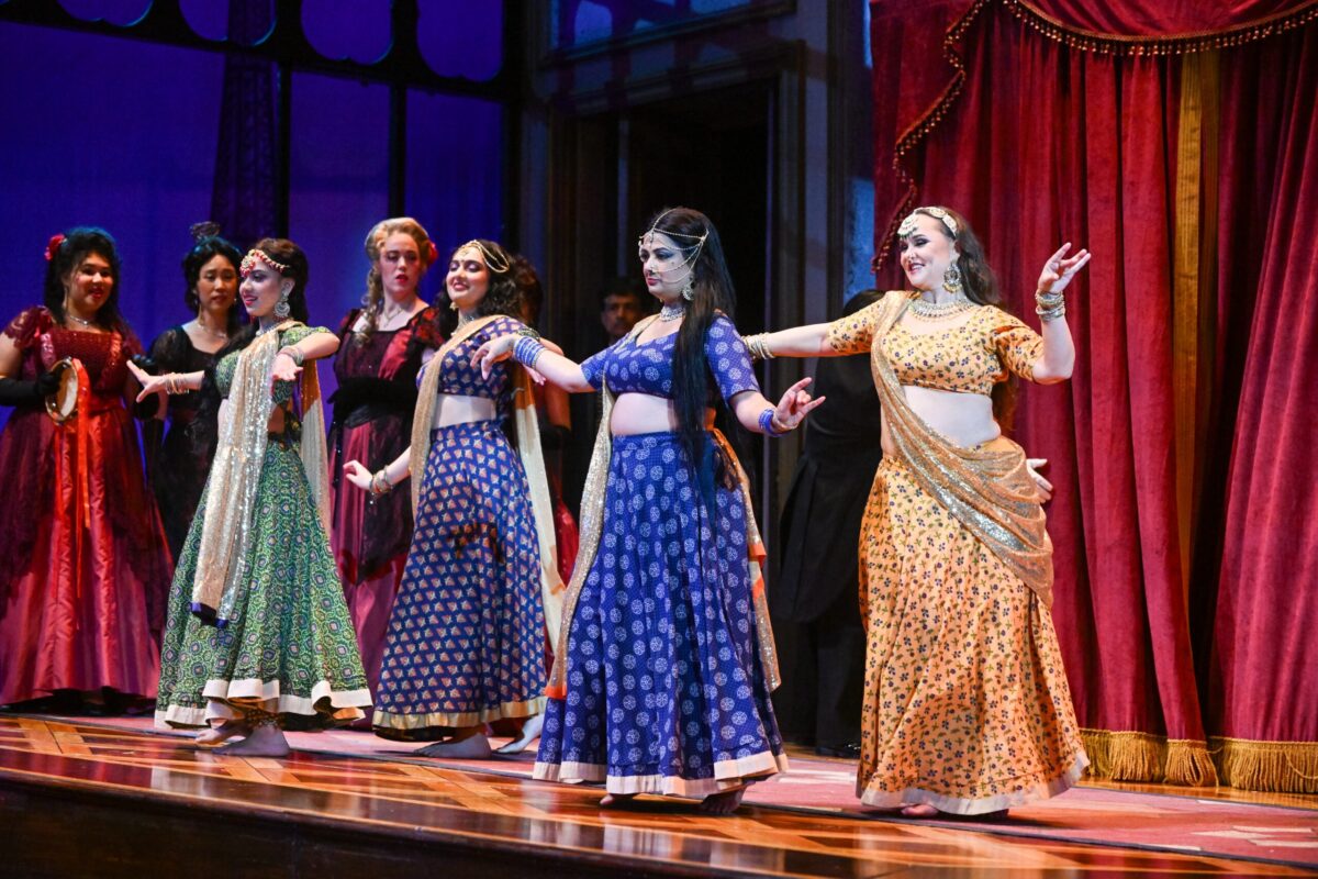Act II was straightforward (though Branham’s staging of Violetta’s maid Annina was again Rossini energy the opera doesn’t need). In a running theme, Barnham’s staging of the more intimate moments was much more effective, so Violetta’s scene with Germont was effective for its simplicity. In the second scene of Act II, the raucous party at Flora Bervoix’s featured a shift from the usual Roma entertainment troupe to a group of Kathak dancers, a form of classical Indian dance. I appreciated this nod to a robust South Asian community in San Jose and a way to connect two classical art forms. Yet it also added an element of orientalism into the opera where none exists. I salute the risk, but the result was an unintentional celebration of cultural voyeurism.